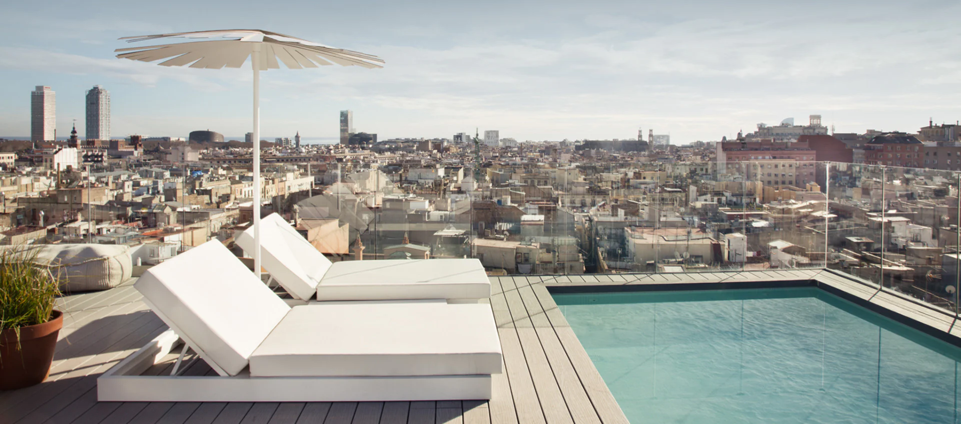 Our incredible terrace with a pool and the best views of the city is one of the best oases hidden in Barcelona. Located on the top floor of the building, it is perfect for relaxing and enjoying the sun.